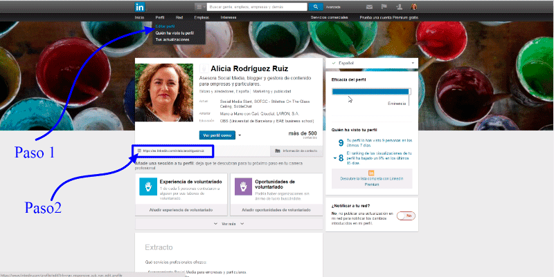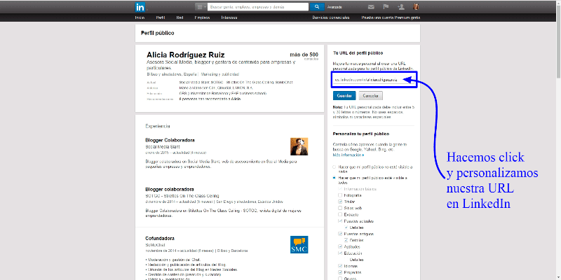 Una vez que hemos accedido al perfil público, clicamos y cambiamos la URL con la denominación que hayamos elegido y que se aconseja sea tu nombre real.