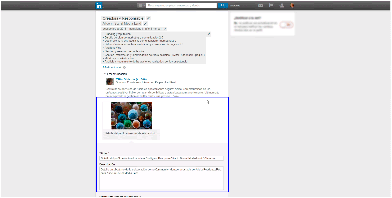 Tienes que buscar rellenar de una forma entendible y que provoque seguir leyendo tanto el extracto como la experiencia. Esto es fundamental para mostrar la valía y provocar el interés del que está leyendo por seguir investigando sobre el valor profesional que se aporta.