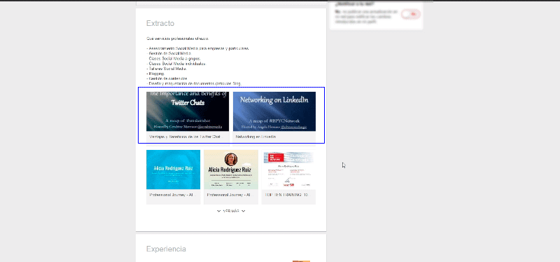 - Inserta en tu extracto herramientas como About.me, Re.Vu y Slideshare para dar un toque más visual a tu perfil general. Este es el ejemplo en mi cuenta de LinkedIn con “mi” About.me.