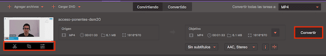 Únicamente tienes que arrastrar el vídeo que quieras convertir y hacer clic en en los botones de la zona izquierda para editarlo.